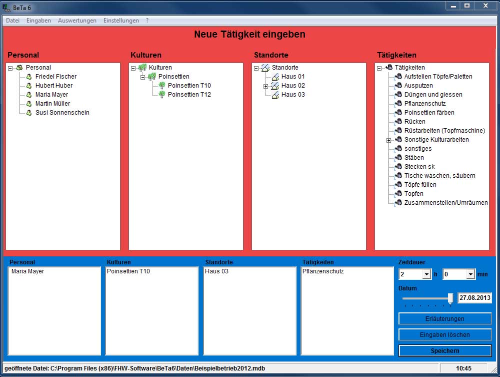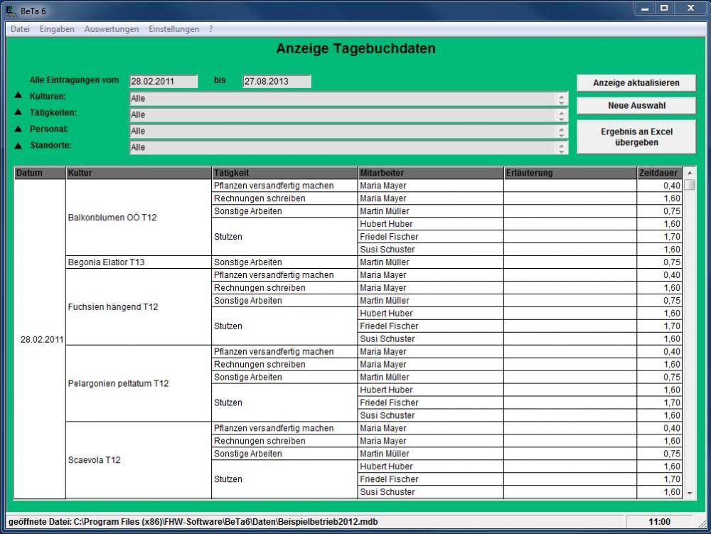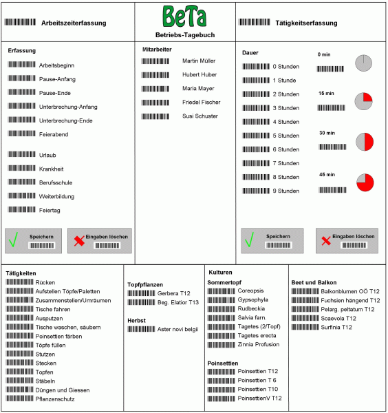 Das Betriebs-Tagebuch BeTa dient der Erfassung aller Arbeitsvorgänge in einem Gartenbaubetrieb. Das Programm verlangt zunächst als Stammdaten Angaben über Mitarbeiter, Kulturen, Standorte und betriebsspezifische Tätigkeiten. Die Eingabe der Arbeitsvorgänge geschieht dann mit einem Barcode-Leser oder am Bildschirm per Drag& Drop.