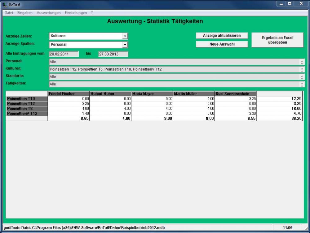 Der Auswertungsteil von BeTa ermöglicht die Erstellung von verschiedenen Listen, wie beispielsweise die Gesamtarbeitszeiten für einzelne Kulturen oder die Aufzeichnung aller Pflanzenschutzmaßnahmen an einem bestimmten Standort bzw. einer bestimmten Kultur.