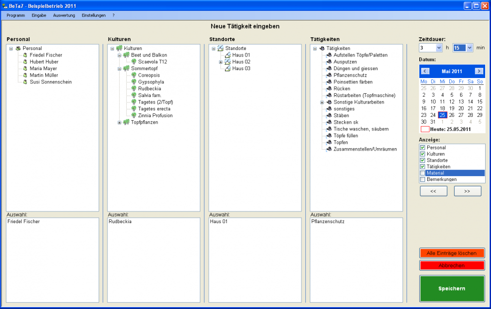 Je nach Betrieb kann das Programm entweder als komplettes Betriebstagebuch eingesetzt werden (Angabe von Kultur, Standort, Mitarbeiter und Tätigkeit sind zwingend notwendig) oder auch nur als Kulturtagebuch (nur Kultur und Tätigkeit müssen angegeben werden) dienen.