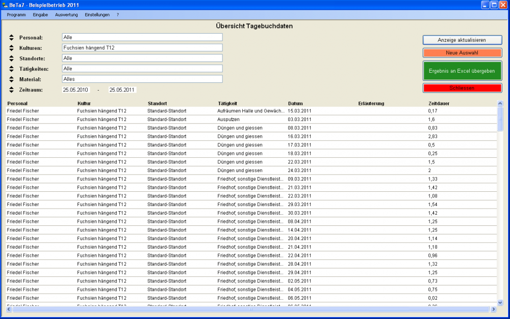 Das Betriebs-Tagebuch BeTa dient der Erfassung aller Arbeitsvorgänge in einem Gartenbaubetrieb. Das Programm verlangt zunächst als Stammdaten Angaben über Mitarbeiter, Kulturen, Standorte und betriebsspezifische Tätigkeiten. Die Eingabe der Arbeitsvorgänge geschieht dann mit einem Barcode-Leser oder am Bildschirm mit der Maus.