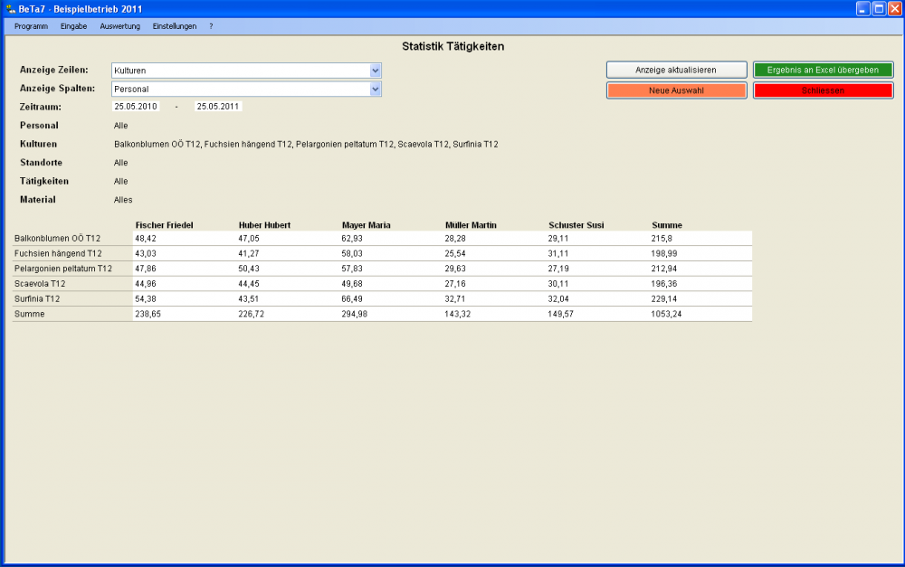 Der Auswertungsteil von BeTa ermöglicht die Erstellung von verschiedenen Listen, wie beispielsweise die Gesamtarbeitszeiten für einzelne Kulturen oder die Aufzeichnung aller Pflanzenschutzmaßnahmen an einem bestimmten Standort bzw. einer bestimmten Kultur.
