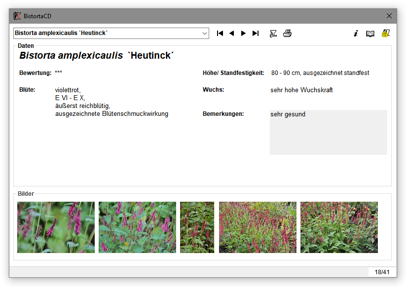 Neben Kurzinformationen wie Blütenfarbe, Blütezeit, Höhe etc., werden auf dieser CD 42 verschiedene Bistorta-Sorten anhand von 210 Bildern vorgestellt.