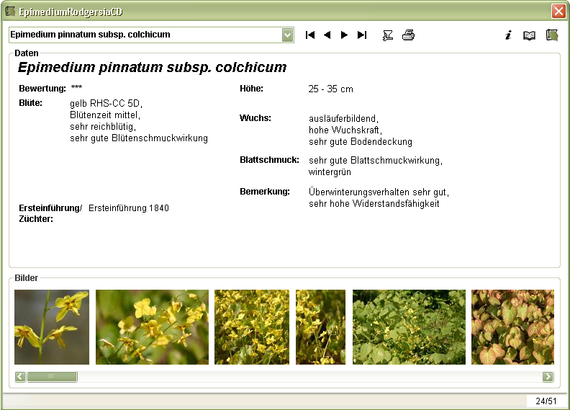 Der Datenbereich umfasst allgemeine Informationen wie den Sortennamen, den Züchter, die Bewer-tung usw.. Im Bilderbereich werden die zu einer Art bzw. Sorte verfügbaren Bilder im Kleinformat angezeigt. Die Bilder der Sorten lassen sich durch Anklicken vergrößern und durch Bedienen der rechten Maustaste oder durch den Button im Bilder-Fenster individuell abspeichern bzw. ausdrucken. Bei der Benutzung können