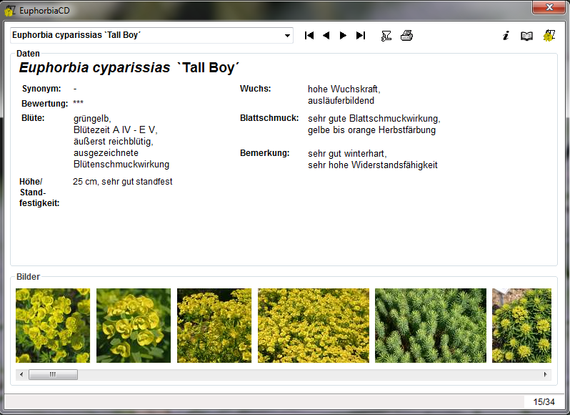 Neben Kurzinformationen wie Blütenfarbe, Blütezeit, Höhe etc., werden auf dieser CD 34 verschiedene Euphorbia-Arten und -Sorten anhand von 176 Bildern vorgestellt.