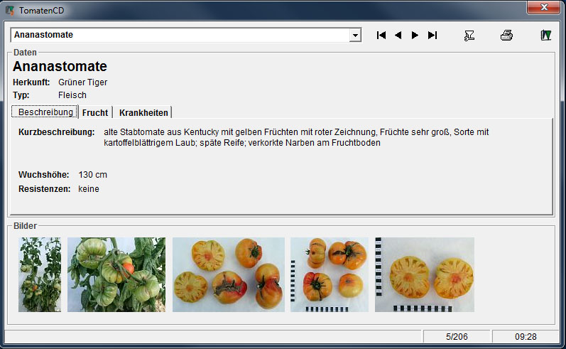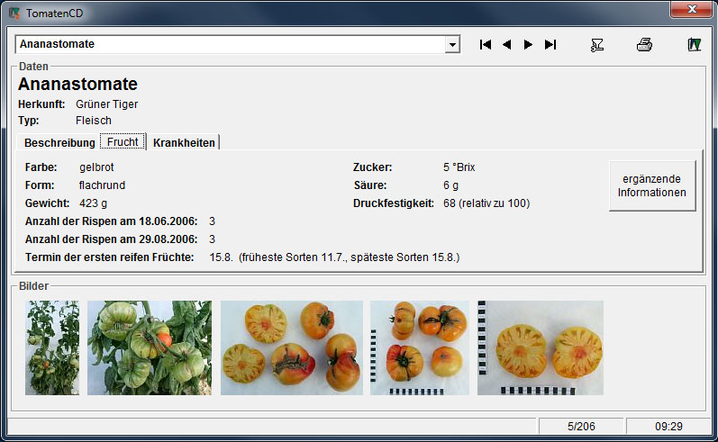 Die Sortenfülle bot den Anlass, alles zu fotografieren, sowohl in Gesamtansicht von Pflanze und Frucht bis hin zum Querschnitt der Tomaten. Rund 1000 Bilder konnten so erstellt und bearbeitet werden und liefern die Grundlage für diese umfangreiche Tomatensorten-CD.