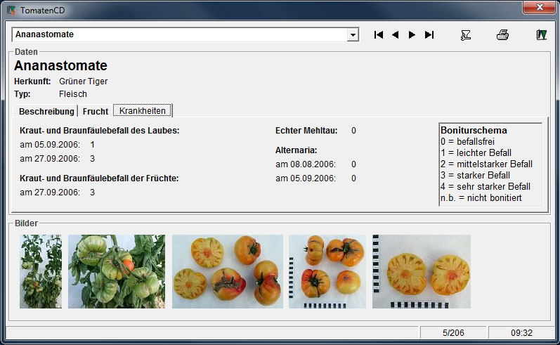Inhaltlich bietet die CD allgemeine Angaben zur Sorte wie Herkunft, Typenbeschreibung, Wuchshöhe und Resistenzen. Weitere Felder mit umfangreichen Informationen zur Frucht und zu Krankheiten charakterisieren jede Sorte. Die Bilder der Sorten lassen sich durch Anklicken vergrößern.